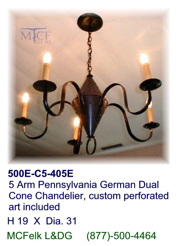 5 Arm Pennsylvania German Dual Cone Chandelier, custom perforated art included.