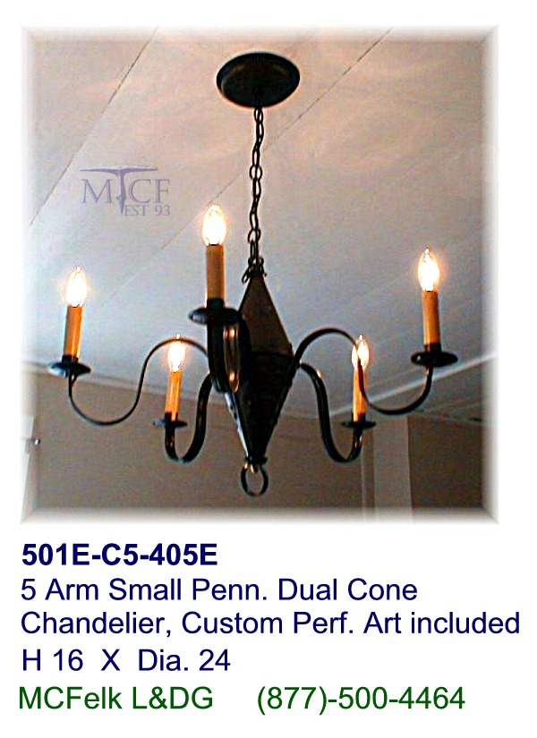 5 Arm Small Pennsylvania German Dual Cone Chandelier, custom perforated art included.