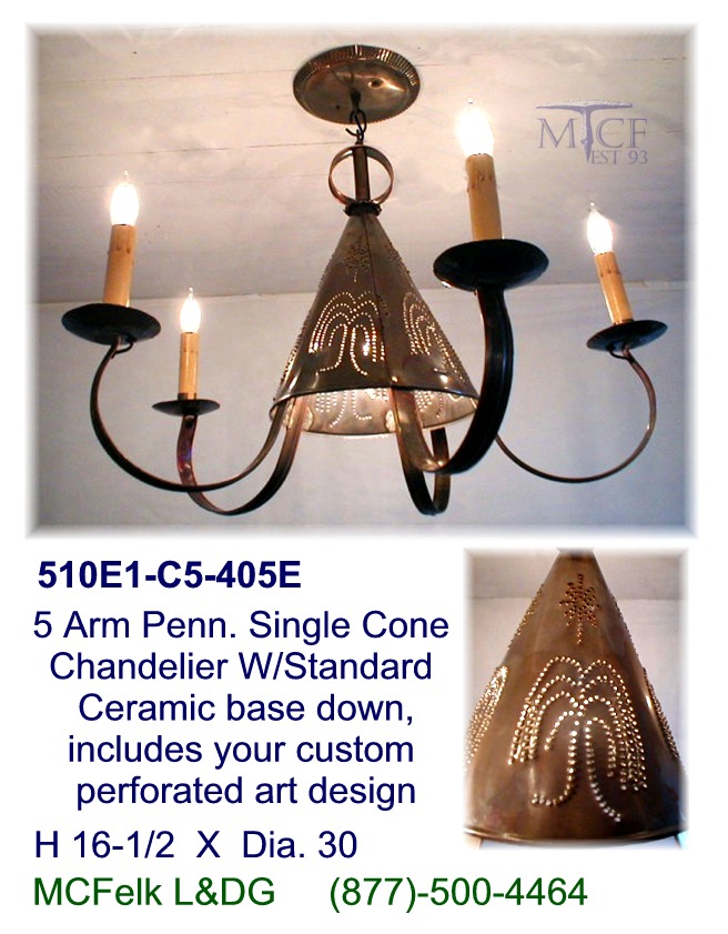 5 Arm-W/Down Pennsylvania German Single Cone Chandelier, custom perforated art included