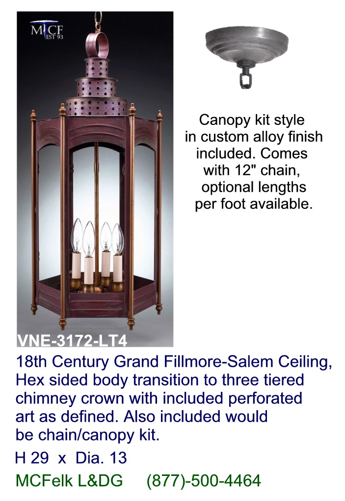 18th Century Fillmore-Salem Ceiling, Hex sided body transition to three tiered chimney crown with included perforated art as defined. Also included would be chain/canopy kit. Optional custom geometry or sizing to application and or chain lengths available. Also available in shorter height plus post mounted options.